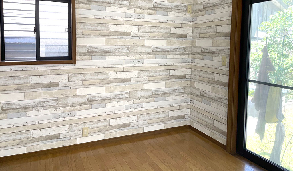 長年の使用で黄ばんだ壁紙を剥がし、奥様お気に入りのウッド調のヴィンテージカラーの壁紙へ張り替えを行いました。